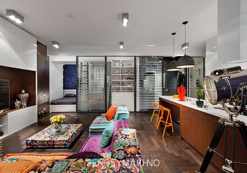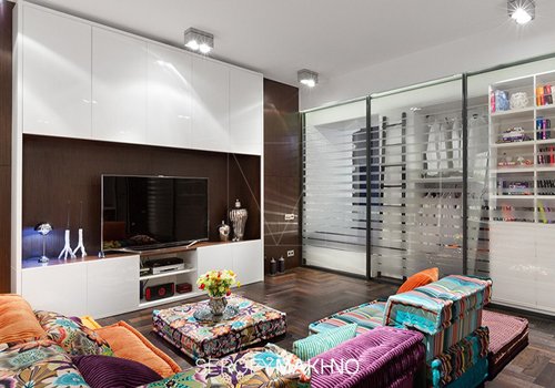 Bộ sofa sắc màu là trung tâm của căn nhà. Chiếc tủ tường đặt tivi đơn giản nhưng có thể chứa rất nhiều đồ mà vẫn gọn gàng, tinh tế.