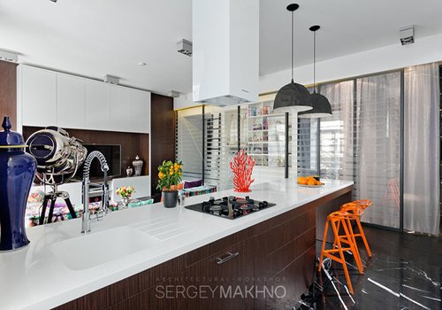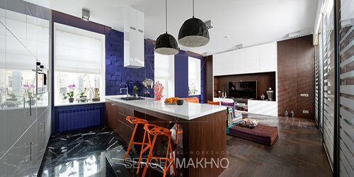 Phần bàn ăn và nấu nướng, rửa bát tạo nên sự ngăn cách giữa nơi nấu ăn và tiếp khách. Người nội trợ có thể vừa chuẩn bị bữa ăn vừa nói chuyện với mọi người và xem tivi.