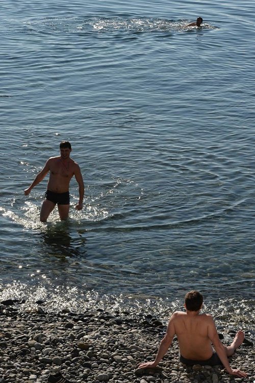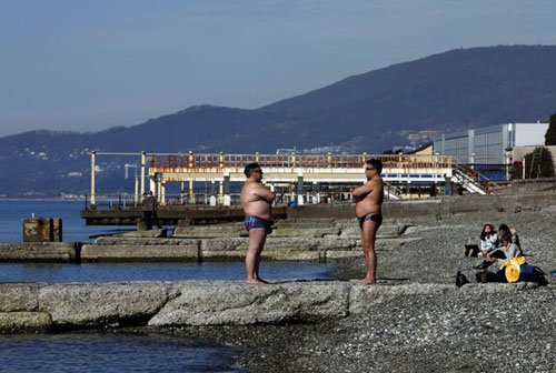 Những người đàn ông cởi trần và thản nhiên tắm như mùa Hè. (Nguồn: Getty)