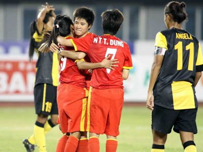 Niềm vui của các nữ cầu thủ Việt Nam sau khi ghi bàn vào lưới đội Malaysia. (Ảnh: TTXVN phát)