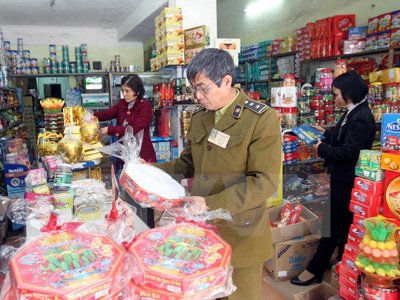 Kiểm tra chất lượng vệ sinh an toàn thực phẩm tại một cửa hàng kinh doanh bánh, mứt kẹo. (Ảnh: Quốc Khánh/TTXVN)