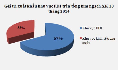Theo số liệu của Tổng cục thống kê Việt Nam, ước 10 tháng năm 2014, kim ngạch hàng hóa xuất khẩu cả nước đạt 123 tỉ USD; tăng 13,4% so với cùng kỳ năm 2013. Trong đó khu vực có vốn đầu tư nước ngoài đạt 82,5 tỉ USD; tăng 13,6% và đóng góp 67% vào tổng kim ngạch xuất khẩu của cả nước.