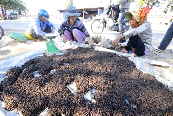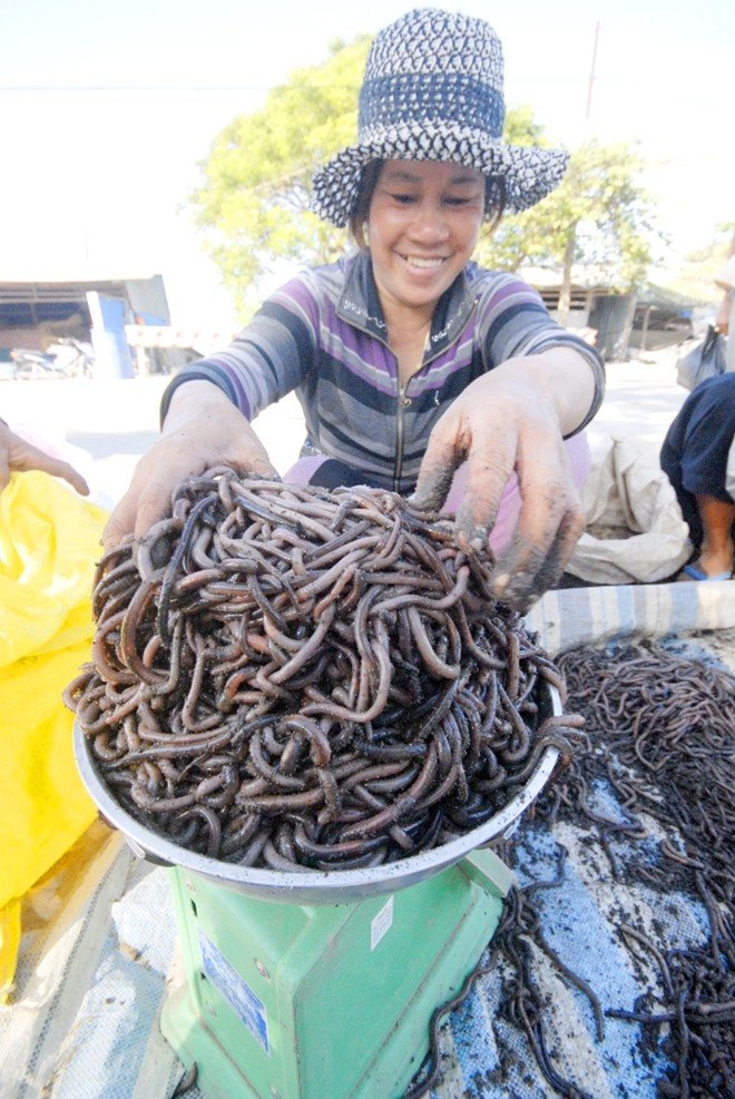 Theo tiểu thương kinh doanh mặt hàng này, đều đặn mỗi ngày có hàng chục kg trùn được người dân Campuchia mang qua chợ bán sỉ. Giá bán mỗi kg trùn từ 15.000 - 20.000 đồng.