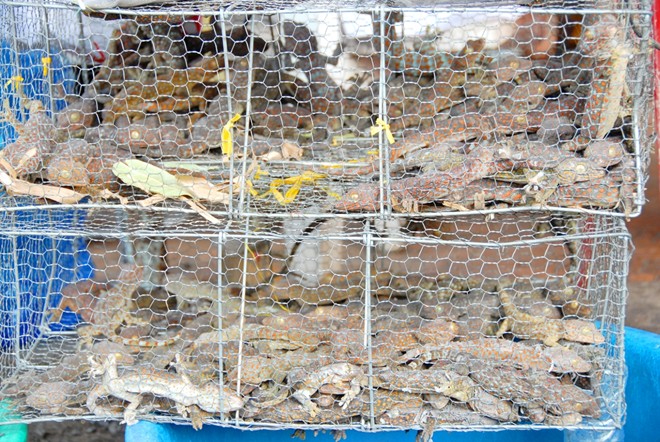 Hàng chục con tắc kè nhốt trong lồng sắt chờ khách mua. Giá bán loài này từ 40.000 -50.000 đồng/con.