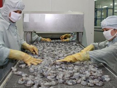 Chế biến tôm xuất khẩu tại tỉnh Hậu Giang. (Ảnh: Huy Hùng/TTXVN)