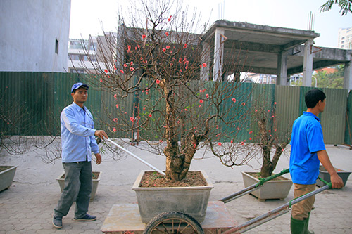 Những gốc đào cổ thụ liên tục được người bán vận chuyển cẩn thậnra địa điểm tập kết.
