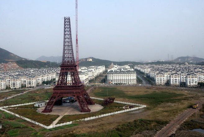Rõ ràng đây không phải là bản gốc tháp Eiffel, biểu tượng của nước Pháp, mà chỉ là một bản nhái thu nhỏ nằm ở Hàng Châu, tỉnh Chiết Giang. Một quan chức địa phương từng cho hay, tháp Eiffel thu nhỏ có kích thước bằng 1/3 so với tháp thật. Ngoài ra, khu dân cư cạnh đó cũng có một đại lộ mô phỏng đại lộ Champs-Elysees nổi tiếng của Paris và một khu vườn mang phong cách Pháp