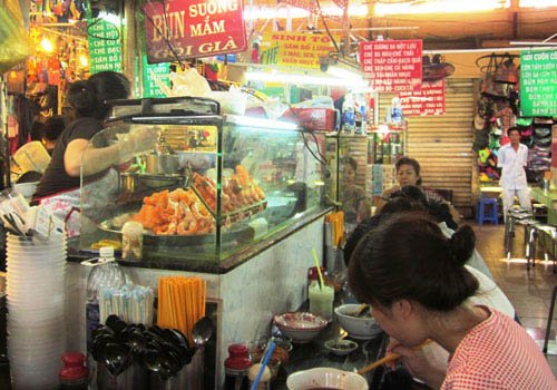 món ăn độc đáo cũng chỉ có ở chợ Bến Thành. Quán này cũng đã tồn tại qua 3 thế hệ. Chị Vân, cháu ngoại của bà Mai - người bán bún suông đầu tiên ở chợ Bến Thành cho biết, món này là do một người ở Vĩnh Long truyền lại cho bà chị. Sau đó bà truyền lại cho mẹ chị và giờ là chị tiếp quản. Giá một tô bún suông 65.000 đồng, chỉ gồm có 2 con suông và một con tôm. Con suông chính là tôm quết nhuyễn với một ít cá thác lác để tạo độ dai, còn màu đỏ là do quét gạch tôm rồi để khô. Nhiều người cho rằng tên "suông" là cách gọi chệch của đuông vì món chả tôm này tạo hình giống như con đuông dừa.