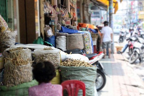 Chỉ cần đến đây ta dễ dàng bắt gặp hàng chục bảng tên, bao tải đựng thuốc bày ra vỉa hè. Thợ bào chế thuốc làm việc ngay trước cửa hiệu, không ngừng thái nhỏ từng cây thảo mộc thành những lát thuốc. Mùi hương của cây đỗ trọng, táo đỏ, đinh lăng…. át của mùi khói xe xung quanh.