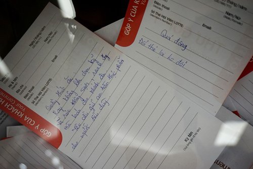 Một ý kiến khách hàng góp ý về chất lượng đồ ăn trong thùng đựng phiếu góp ý tại siêu thị trong Lotte Center. Ảnh: Diệp Sa.