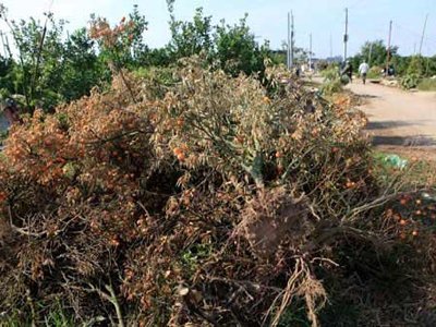 Còn gần 2 tháng nữa mới đến Tết, thế nhưng, những ngày gần đây, nhiều cây quất còn nguyên rễ, quả chín vàng đã bị chết héo khô nằm chất đống ở ven đường dẫn vào các khu vườn trồng quất.