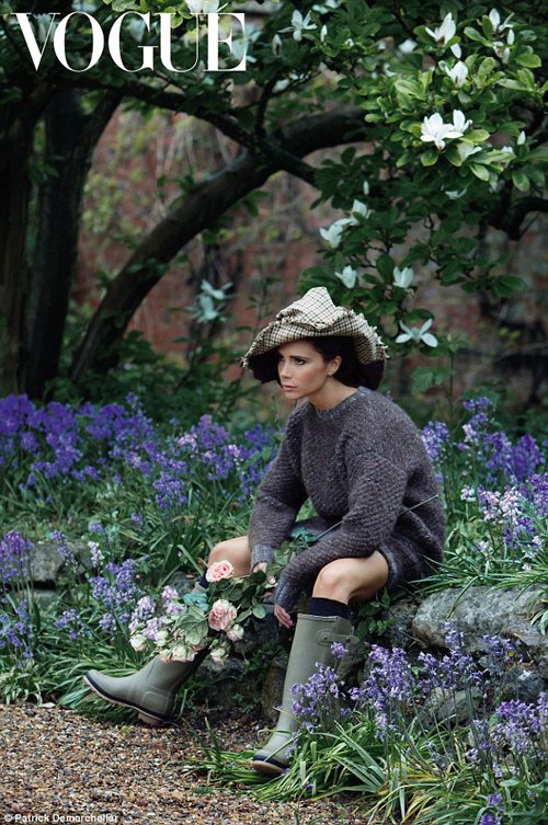 Trong ảnh, Bà Becks vận chiếc áo len dáng nam oversize rộng thùng thình màu lông chuột, chiếc mũ vải mềm kẻ ca-rô của các cô gái quê nước Anh, đôi ủng màu rêu nhạt và xỏ chiếc tất dài kiểu cầu thủ màu xanh tím than sẫm. Tóc cô búi gọn sau gáy, tay cầm cành hoa hồng, ngồi thảnh thơi trên bậc thềm đá đầy hoa dại. Trông cô chẳng có vẻ gì là nhà thiết kế thời trang danh tiếng, ngôi sao giàu có hàng đầu nước Anh.
