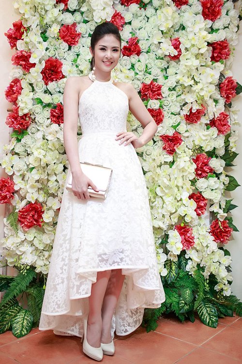 Hoa hậu Ngọc Hân chọn phong cách thanh lịch, nền nã khi dự buổi tiệc khai trương tại Hà Nội. Bộ váy chất ren dáng mullet nhẹ nhàng phù hợp với hình ảnh nữ tính vốn có. Cách mix phụ kiện hoa tai hạt ngọc trai, túi clutch và giày đồng gam trang phục thể hiện khả năng mix&match tinh tế của người mặc.