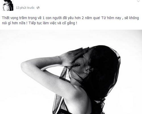 Trên trang cá nhân cô viết: "Thất vọng trầm trọng về 1 con người đã yêu hơn 2 năm qua! Từ hôm nay, sẽ không nói gì hơn nữa! Tiếp tục làm việc và cố gắng !"