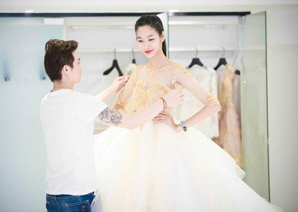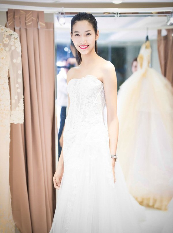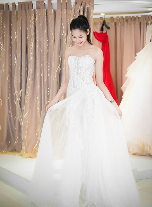 Mới đây, Hoàng Thùy có buổi chụp hình váy cưới tại một showroom ở Hà Nội. Quán quân Vietnam's Next Top Model tỏ ra khá thích thú khi được mặc váy cô dâu.