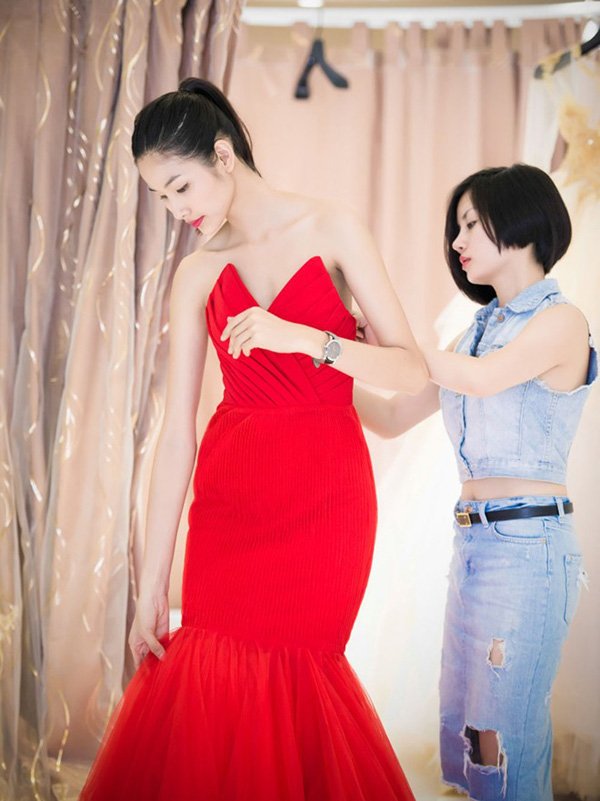 Ngay cả khi ở trong phòng thử đồ, Hoàng Thùy cũng tạo dáng chuyên nghiệp như trên sàn diễn.