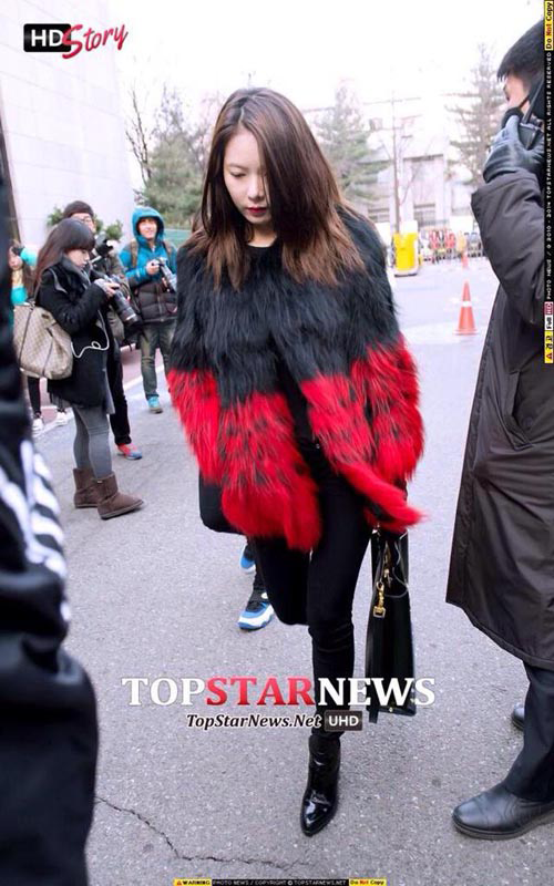 Áo khoác lông thú hai màu là item cực sang chảnh khẳng định đẳng cấp của cô nàng cá tính Hyun Ah. Nhiều người sợ chất kiệu lông thú sẽ khiến người mặc cảm thấy già nhưng một chút màu sắc nổi bật khiến sản phẩm này trở nên thông dụng hơn.