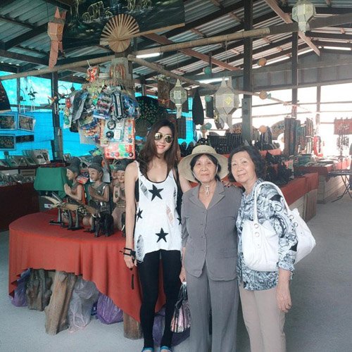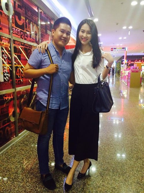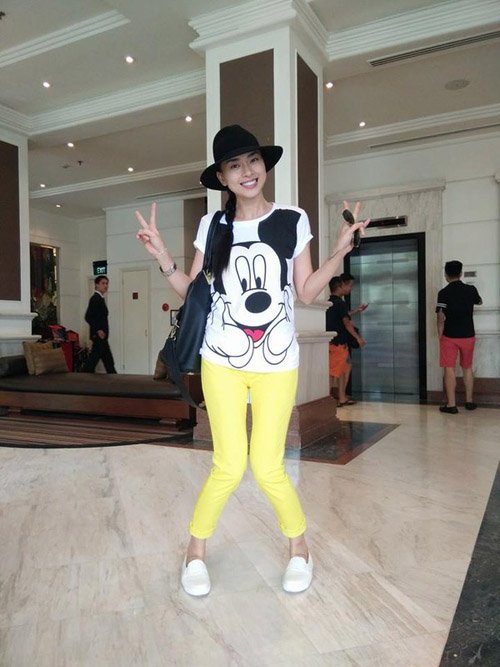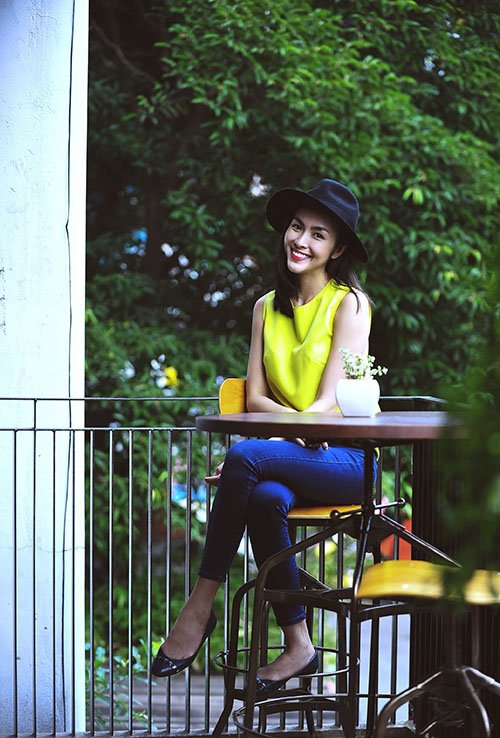 Hà Tăng chọn cho mình set đồ đơn giản với sơ mi sát nách màu vàng chanh phối cùng quần jeans, giày bệt và mũ rộng vành.
