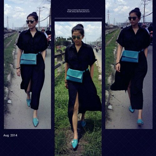 Một set đồ không mấy hài hoà của Trương Thị May, với chiếc váy đen xẻ tà luộm thuộm, phối chẳng mấy liên quan cùng túi và giày da mũi nhọn màu... xanh ngọc.
