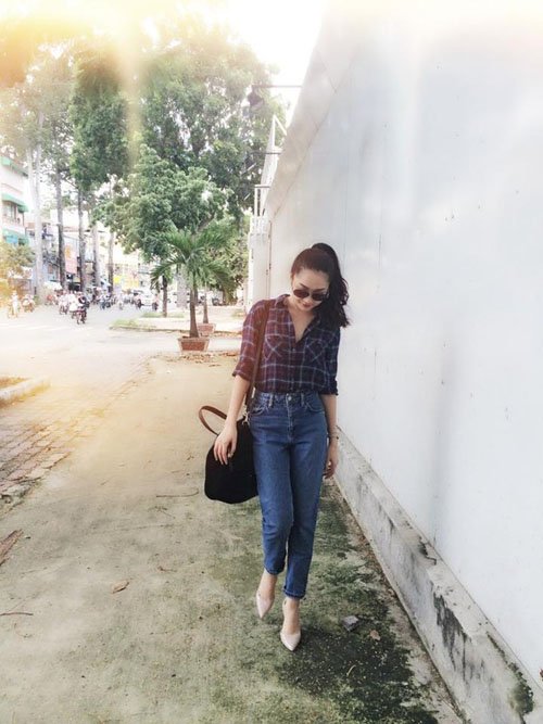 Bảo Anh nhìn thật cá tính với set đồ sơ mi kẻ phối cùng quần jeans ống suông, giày cao gót mũi nhọn màu nude và túi đeo bản lớn.