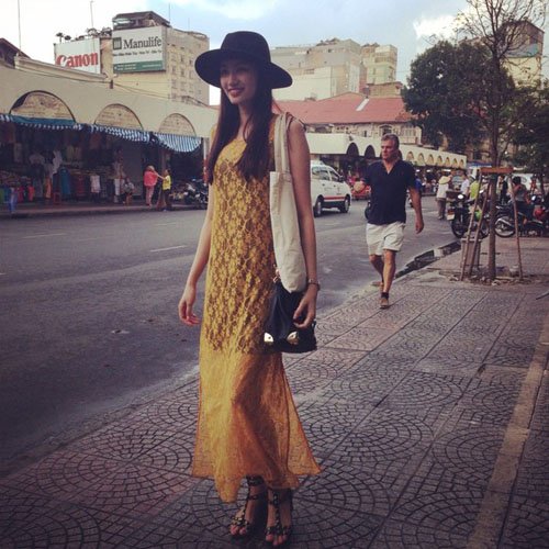 Trúc Diễm chọn phối váy maxi ren màu vàng mustard với gladiator sandal và mũ rộng vành để xuống phố. Nhìn cô khá nổi bật nhưng không hề bị cầu kỳ, nặng nề.