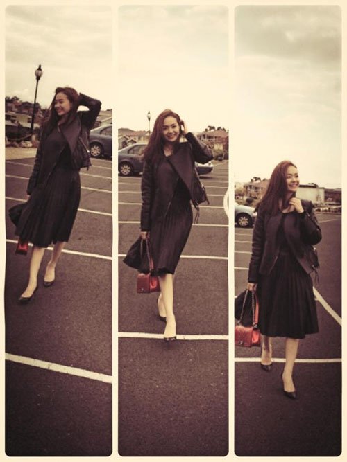Minh Hằng nhìn khá già khi phối váy xếp ly đen xoè với áo khoá da và túi