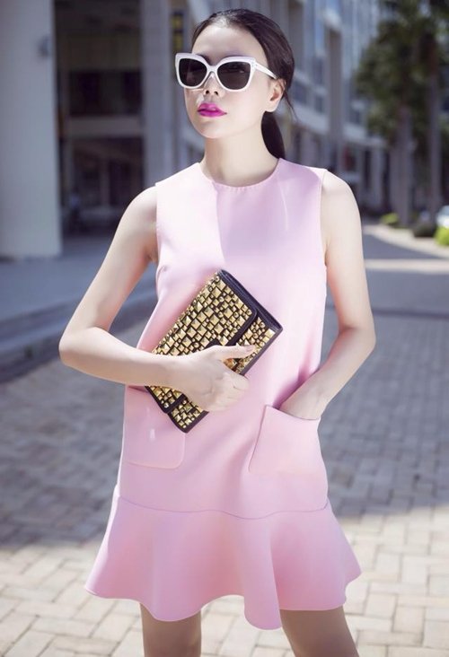 Á hậu cuộc thi Hoa hậu Việt Nam hoàn cầu 2011 không ngại chi để đầu tư những món hàng hiệu, từ cao cấp đến bình dân. Trong set đồ này, cô diện áo chấm bi to bản Burberry, chân váy Zara, ví cầm tay MK và kính mắt LV.