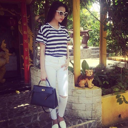 Trà Ngọc Hằng lại chuộng chiếc quần rách gối, kết hợp áo phông trẻ trung, cá tính.