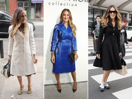 Sarah Jessica Parker tự biến mình thành... kẻ lười biếng khi chỉ mặc chiếc áo khoác che hết váy áo bên trong, kết hợp với một chiếc túi xách đơn giản.