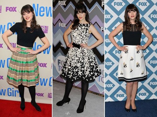Nữ diễn viên mới nổi Zooey Deschanel chuộng style váy áo vintage họa tiết đơn giản.