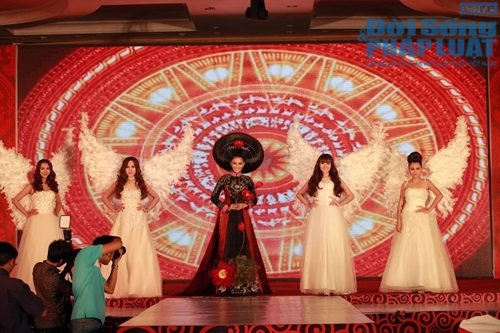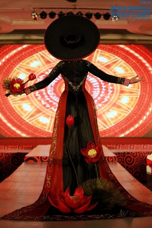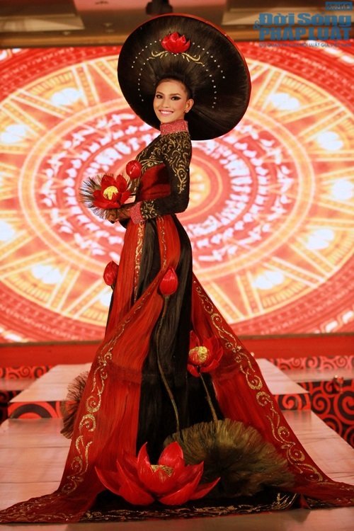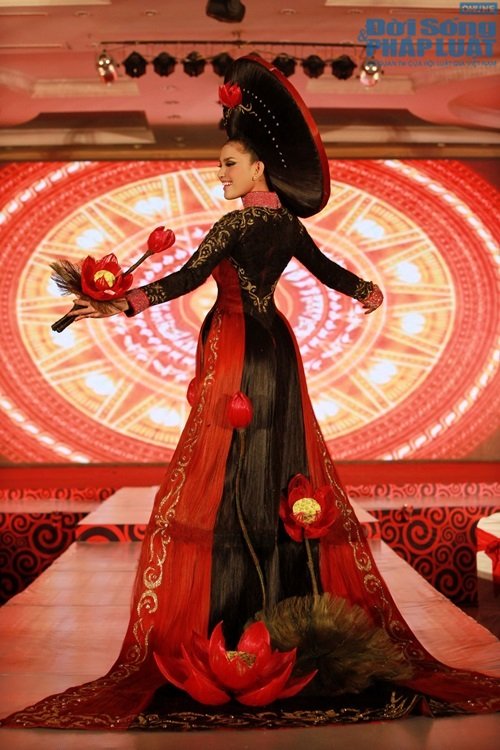 Đây là bộ trang phục mà Sáng Tân Vĩnh làm riêng cho Trương Thị May trình diễn, lấy cảm hứng sáng tạo từ sen cũng như hình ảnh Trương Thị May dự thi Hoa hậu Hoàn vũ 2013 vừa qua.Chia sẻ cảm xúc khi được khoác lên người bộ áo dài này, Trương Thị May cho biết : “May rất yêu những chiếc áo dài truyền thống và bộ áo dài đặc biệt này cũng là một trong những chiếc áo dài để lại cho May nhiều ấn tượng nhất. Sự sáng tạo của nhà tạo mẫu Sáng Tân Vĩnh cũng cho thấy sức lan tỏa, sự đa dạng và ẩn chứa kho tàng văn hóa Việt trong chiếc áo dài, áo dài xứng đáng là biểu trưng cho nét đẹp và con người Việt Nam. May cũng rất cảm ơn, nhà tạo mẫu tóc đã chọn May trình diễn bộ trang phục đẹp mắt này…”.