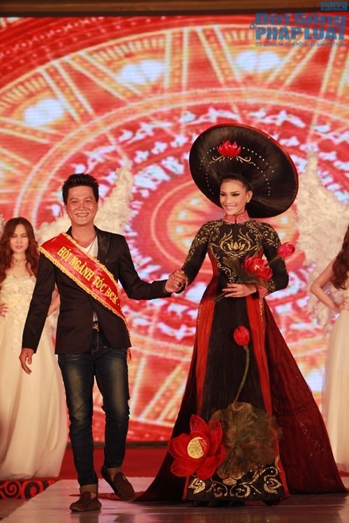 Được biết, nhà tạo mẫu tóc Sáng Tân Vĩnh đã dung tóc làm chất liệu chính để tạo nên bộ trang phục áo dài đặc biệt này.