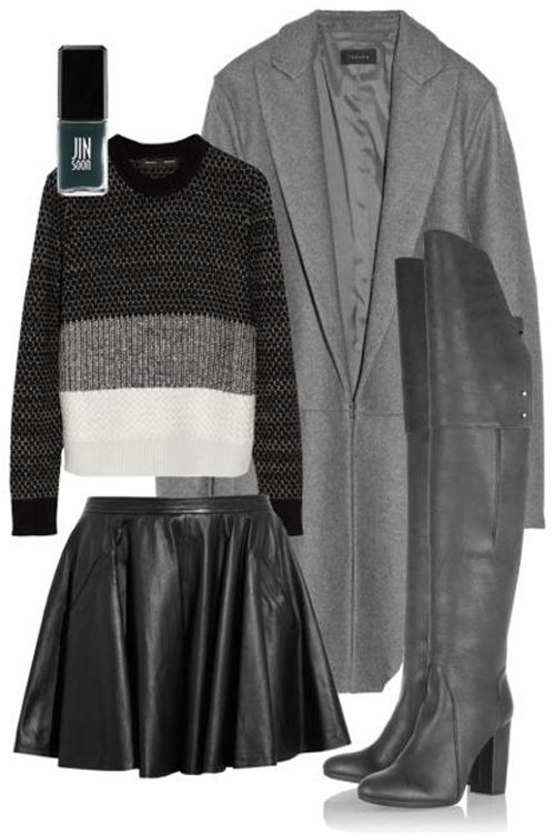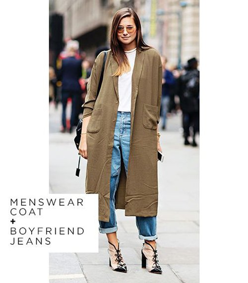 Váy da, sweater len và boots cổ cao đơn giản trông "high fashion" gấp nhiều lần khi kết hợp cùng áo choàng menswear. Nếu muốn khác biệt hơn, bạn có thể đi những đôi loafer oxford da đế bằng cùng với legging cùng tông để tạo "hiệu ứng kéo dài chân".