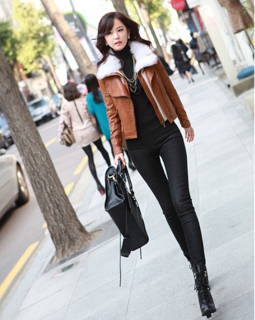 Nếu thích phong cách khỏe khoắn, năng động, bạn có thể chọn những chiếc áo khoác da cổ lót lông khác màu với màu áo như thế này.