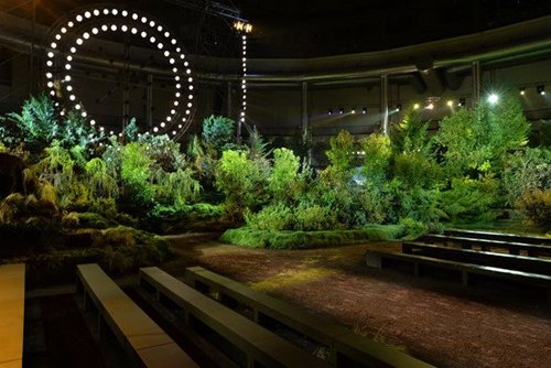Toàn bộ không gian trình diễn được biến thành một khu vườn sinh thái gồm vô số những loài cây khác nhau lấy cảm hứng từ công viên Oasi Zegna ở núi Alps Biella.