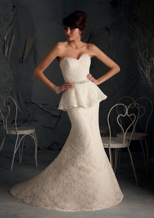 Chất liệu ren cùng kiểu váy peplum mềm mại giúp cô dâu trông mềm mại và nữ tính hơn. Đây sẽ là lựa chọn hàng đầy cho những cô dâu vai nhỏ bởi phần cúp ngực sẽ giúp bạn thể hiện nét đẹp của mình.
