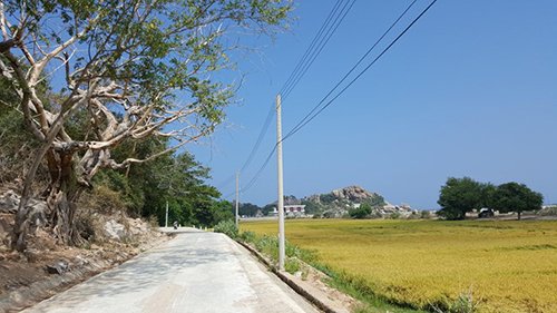 Đường vào Hang Rái lúa vàng phủ lối, trời xanh cao ngút mắt người nhìn. Đó là một nơi có địa chất hết sức đặc biệt, là rạng san hô cổ hàng ngàn năm, do dịch chuyển địa tầng, nay trở mình lộ thiên giữa trời biển.