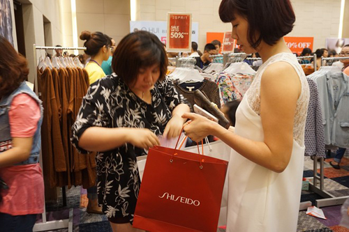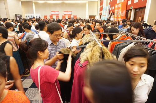 Tại sảnh tầng 2, hàng nghìn người tranh nhau chỗ đứng tốt để có thể tiếp cận với cửa vào gian bán hàng luôn đóng vì quá tải. Khách tới mua hàng hiệu giảm giá đủ mọi thành phần, lứa tuổi. Nhiều bố mẹ không lường trước sự việc đã mang cả con nhỏ chen chúc trong không gian ngột ngạt, nhiều bà bầu cũng không ngại chen lấn xếp hàng.