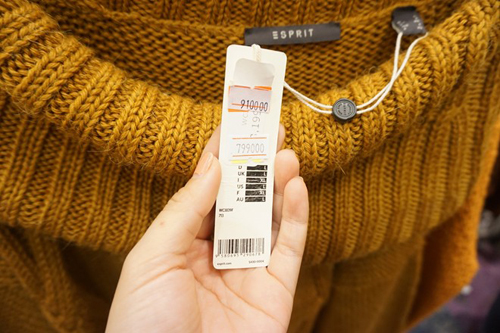 Giá giảm 30-50%, nhưng số tiền khách phải trả cũng không hề rẻ, từ 1 đến vài chục triệu đồng/sản phẩm. Trong ảnh là một mẫu áo len thương hiệu Esprit bán giảm giá khá đắt khách. Theo nhân viên đứng quầy, sau khi bán khoảng 30 phút, cả dây áo chỉ còn duy nhất 1 chiếc cỡ lớn.