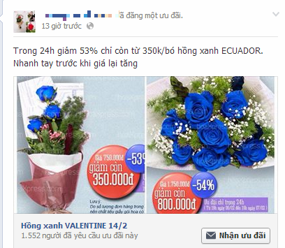 Xuất hiện trên một shop bán hàng online trên facebook có tên 38degreeflowers với giá 750 ngàn đồng một bó giảm còn 350 ngàn một bó. Đối với lãng hoa hồng xanh thì giảm từ 1.750 ngàn xuống còn 800 ngàn chỉ trong ngày mùng 6/2. Vì thế, hoa hồng xanh của shop này nhanh chóng thu hút và nhận được hơn 1,5 triệu người nhận ưu đãi.