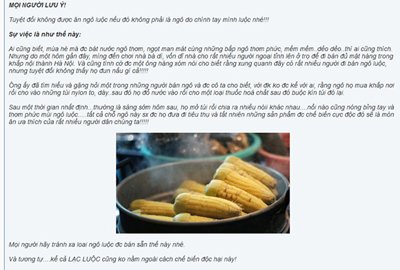 Vợ chồng ông Sơn, bà Khánh quê ở Lý Nhân –Hà Nam có thâm niên bán ngô dạo tại Hà Nội tính đến nay đã 10 năm kể lại: Tôi xếp ngô gọn gàng vào bao chở đi bán thì khách họ hỏi: “Sao ngô lại xếp gọn gàng thế này? Để ủ thuốc à? Một vài người khác thì bắt tôi ăn hết bắp ngô rồi họ mới mua. Mà cả ngày ai cũng như vậy thì tôi ăn sao nổi hả chú (PV)? Đấy là với những người họ mua quen và tin tôi, còn lại thì họ quay lưng với ngô luộc hết rồi.
