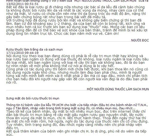 Trên trang internet bán loại rượu ngâm rễ cây trị mụn này, rất nhiều phản hồi của khách hàng cho rằng việc nổi mẩn, sưng mặt là không bình thường chứ không phải là hiện tượng được cho là bình thường như lời quảng cáo.
