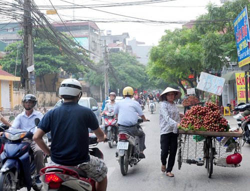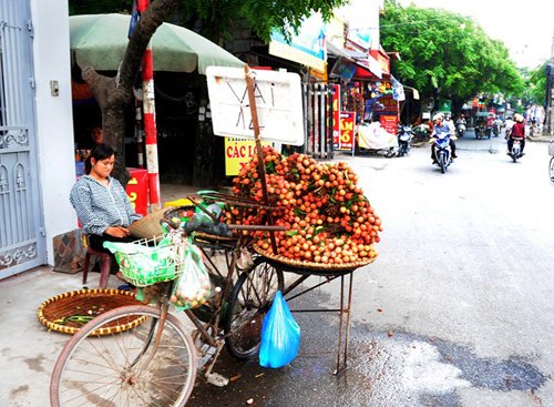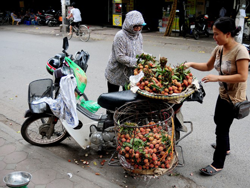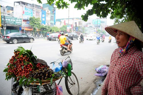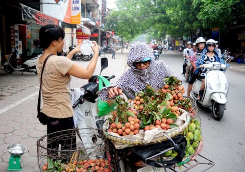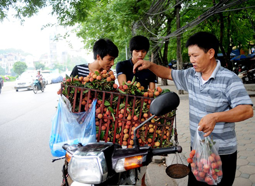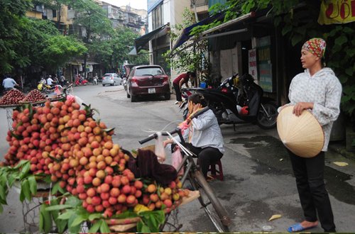 Chị Xuân, Quê ở Văn Giang, Hưng Yên có chồng bị tai biến liệt nửa người 3 năm nay. Trong gia đình, chị là lao động chính, nuôi chồng và 2 con đang học đại học. Hàng ngày, 3h sáng, chị Xuân ra chợ Long Biên lấy hàng rồi đi bán dạo quanh Hà Nội. Chị cho biết, giá vải nhập vào khoảng 7.000 đồng/kg, giá bán ra 10.000-12.000 đồng/kg. "Mấy hôm nay vải đắt hơn, nhập vào 8.000 đồng/kg, bán ra vẫn chỉ 12.000-13.000 đồng/kg nhưng khá hao. Mình chở bằng xe đạp thồ nên không chở được nhiều, Hôm nào đắt hàng thì bán được khoảng 80kg, còn hôm ế hàng thì chỉ được 30-40kg. Lời lãi không được bao nhiêu, chưa kể đến việc bị bắt 5 lần vì quy định cấm bán hàng rong trên phố, toàn mất trắng", chị nói.