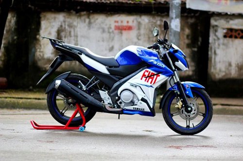 Chiếc FZ150i nguyên bản màu trắng được sơn tem đấu, phối màu xanh GP và sơn chóa đèn màu tím mờ.